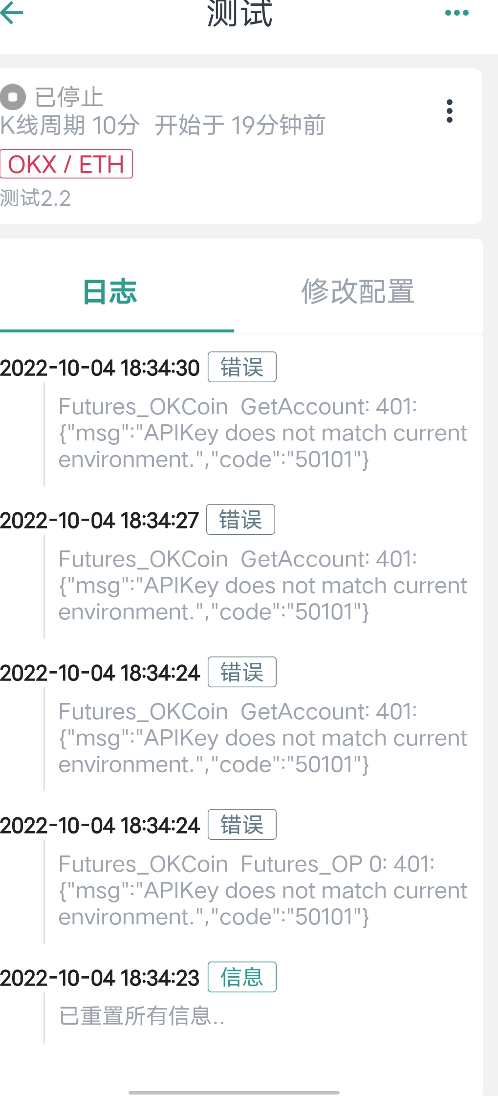您好,这类报错一般是您使用了模拟盘的API KEY ,然后实盘上没有切换到模拟盘。或者使用了实盘的API KEY, 但是实盘环境切换到了模拟盘。 ``` %% // 这里面可以调用发明者量化的任何API scope.INIT = function() { exchange.IO("simulate", true) } %% INIT(); ``` 可以这样切换一下试下。