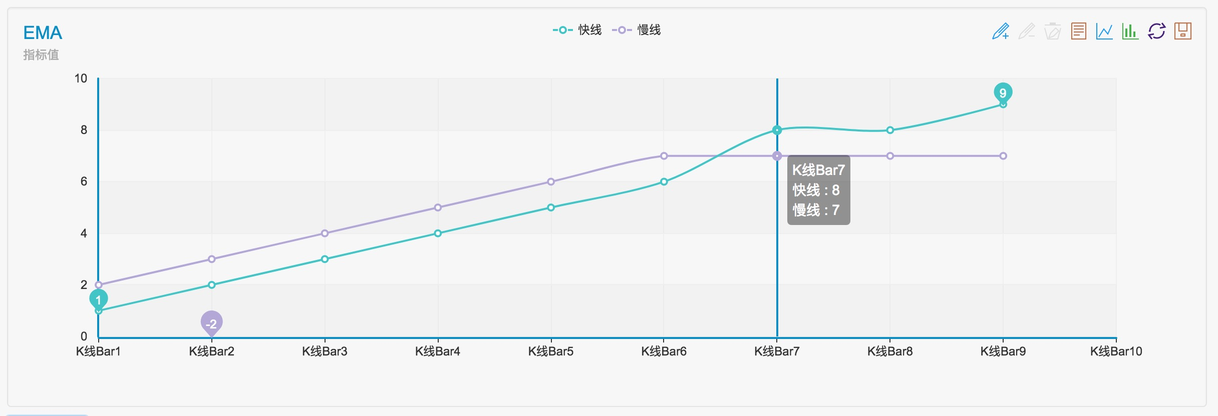 It can be seen, at this time arr1 upward penetrated the arr2 has been n cycles, at this time, it’s the fast line upward penetration the slow line, representing a crossup.