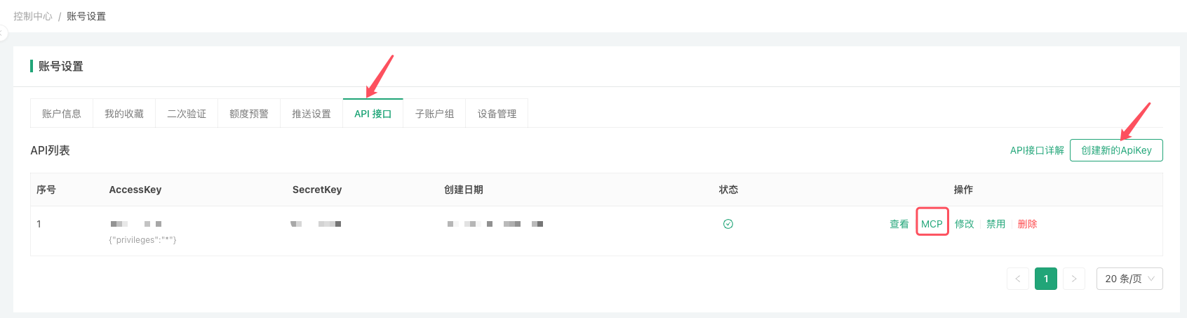 3、API列表中的一行信息就是已经创建好的一个FMZ平台API KEY,最右侧有「操作」选项,点击「MCP」选项。