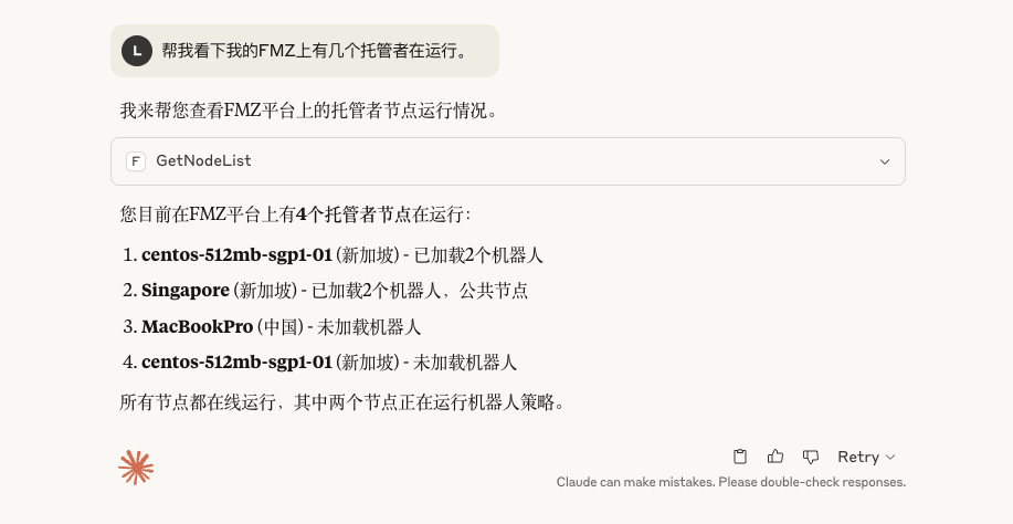 在 Claude desktop APP 中我向 Claude 提问:“帮我看下我的FMZ上有几个托管者在运行。”