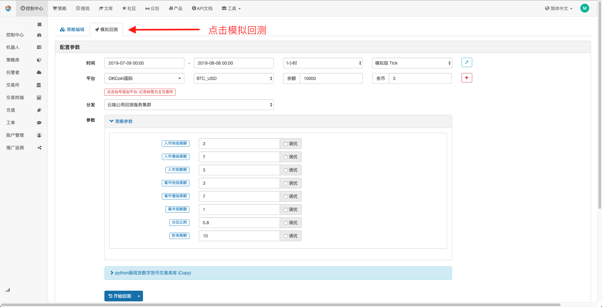 点击模拟回测,可以看到有很多可以调节的参数,可以直接在里面修改,对于以后策略越来越复杂,参数越来越多,这种方式的修改可以帮助用户免去再到代码中逐个修改的烦恼,方便快捷,且条理清晰。