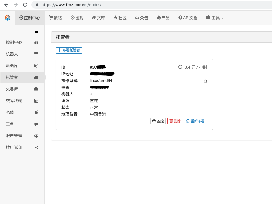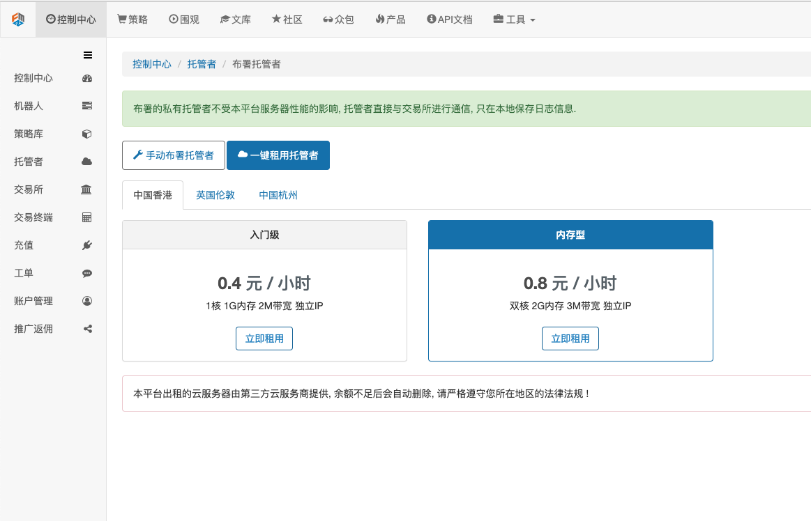 具体操作为:登陆FMZ.COM,点击控制中心,托管者,在托管者页面点击一键租用托管者。