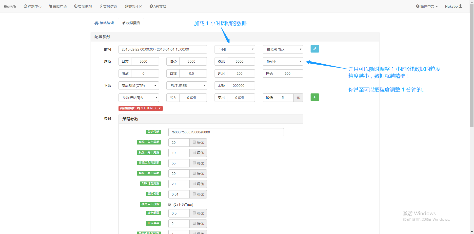 后边的调优选项可以自动优化所设置参数,系统会尝试各种最优的参数,帮助策略开发者找到最优选择。