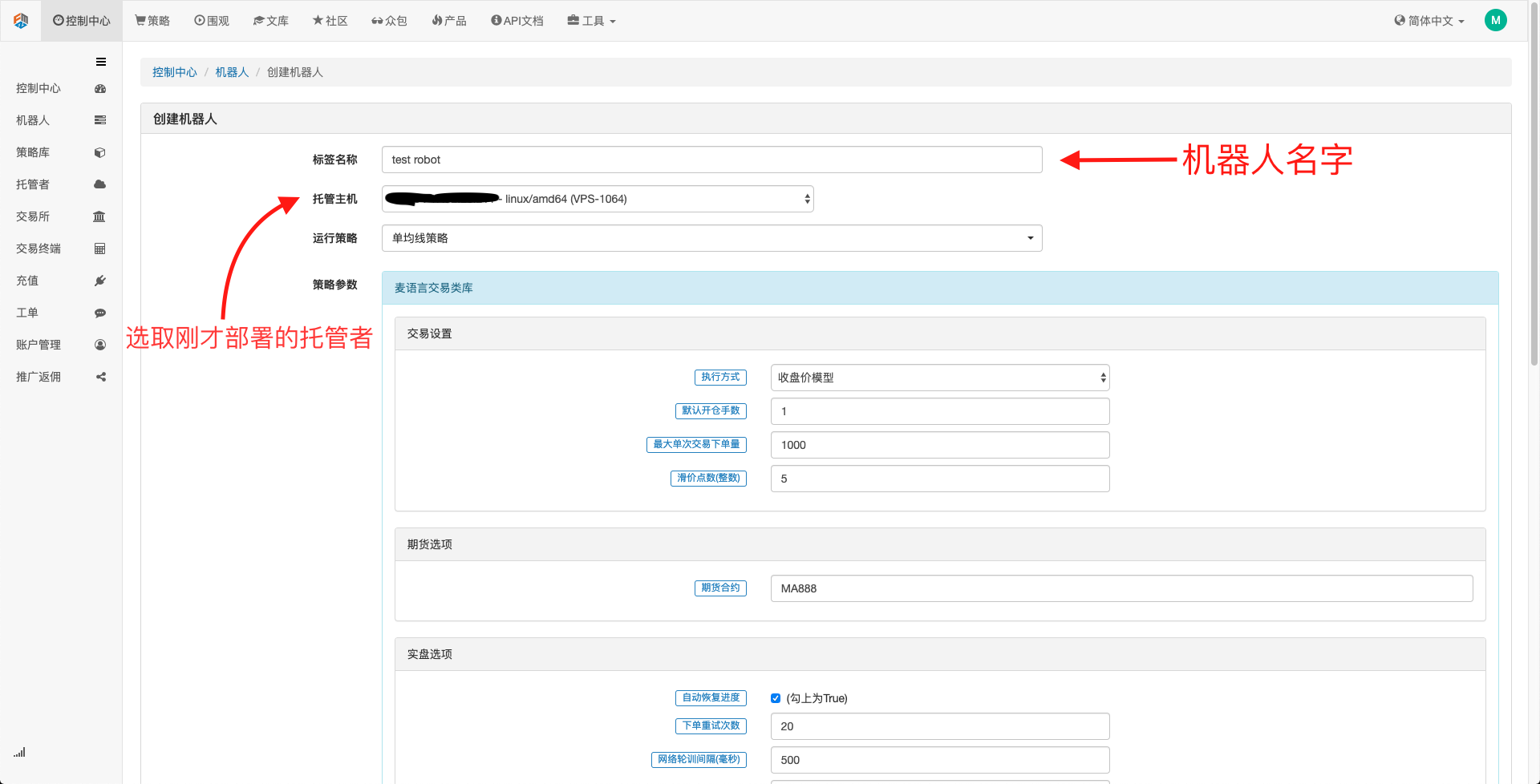 创建机器人很简单,在部署好托管者后,点击左边的机器人栏目,点击创建机器人,在标签名称中填写一个名字,托管主机当中选择刚才部署好的托管者。下边的对话框中的参数选择和K线周期等可根据具体情况进行选择,主要是要配合交易策略选择。