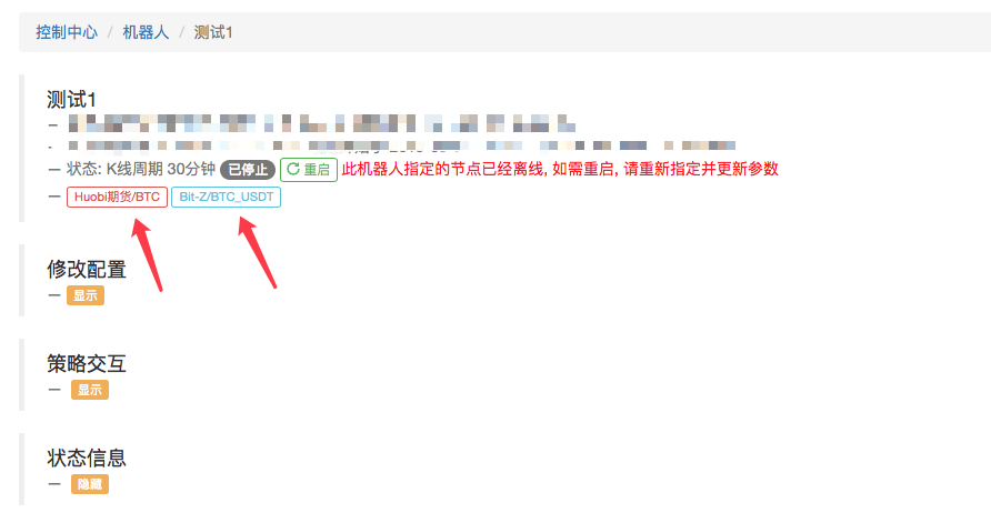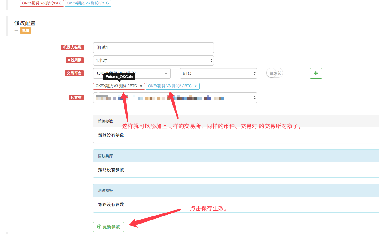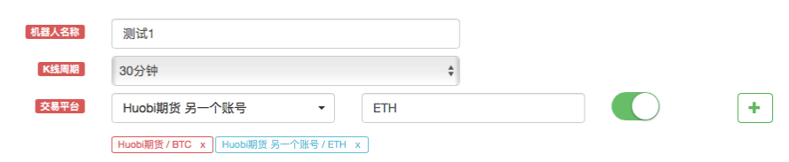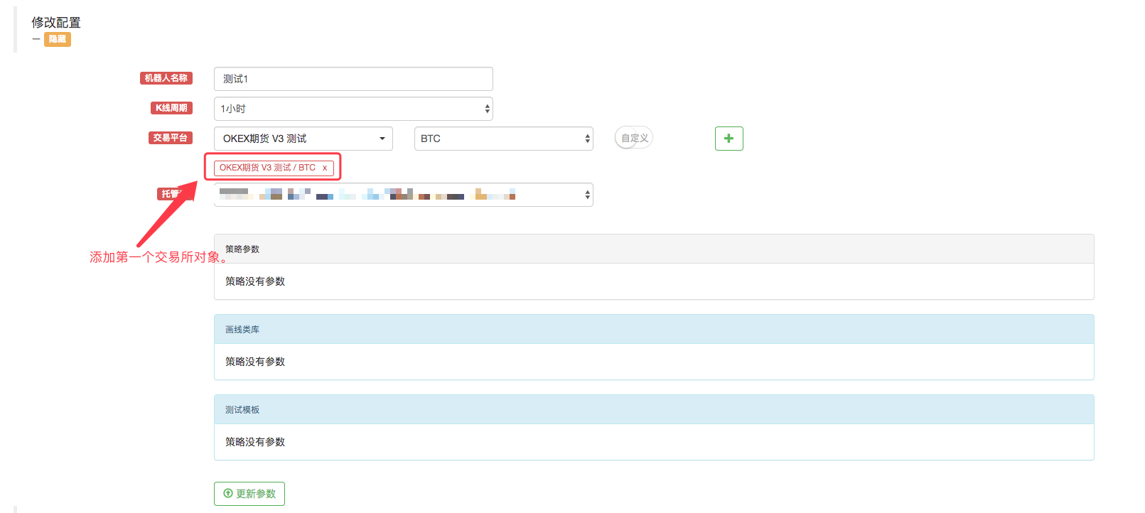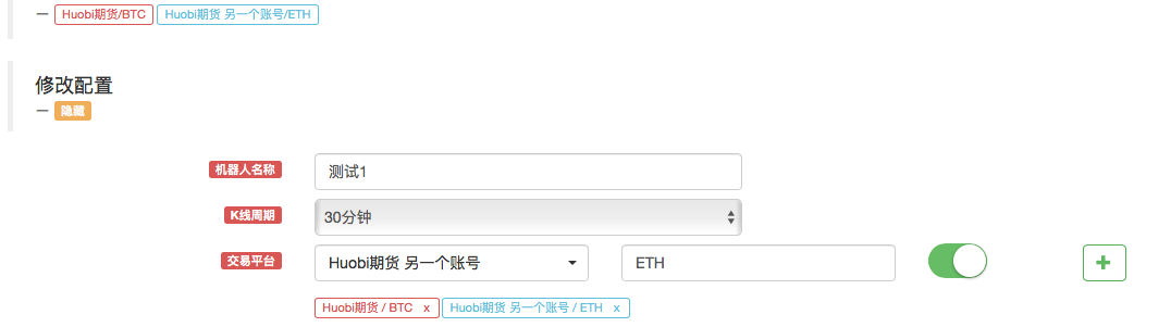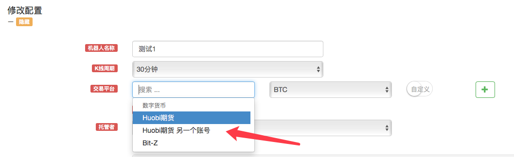 在创建策略时,机器人的 「修改配置」 选项中就又出现了一个火币期货交易所对象以供选择。