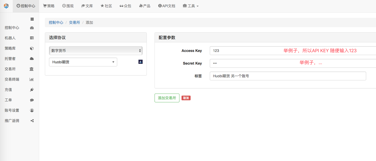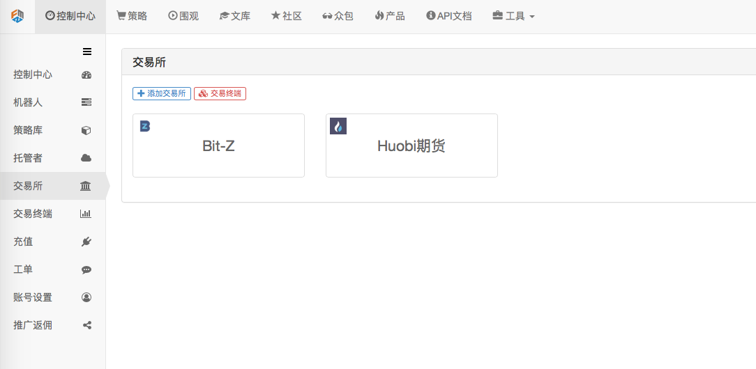 例如,我在控制中心->交易所->添加交易所 页面,配置了2个交易所。