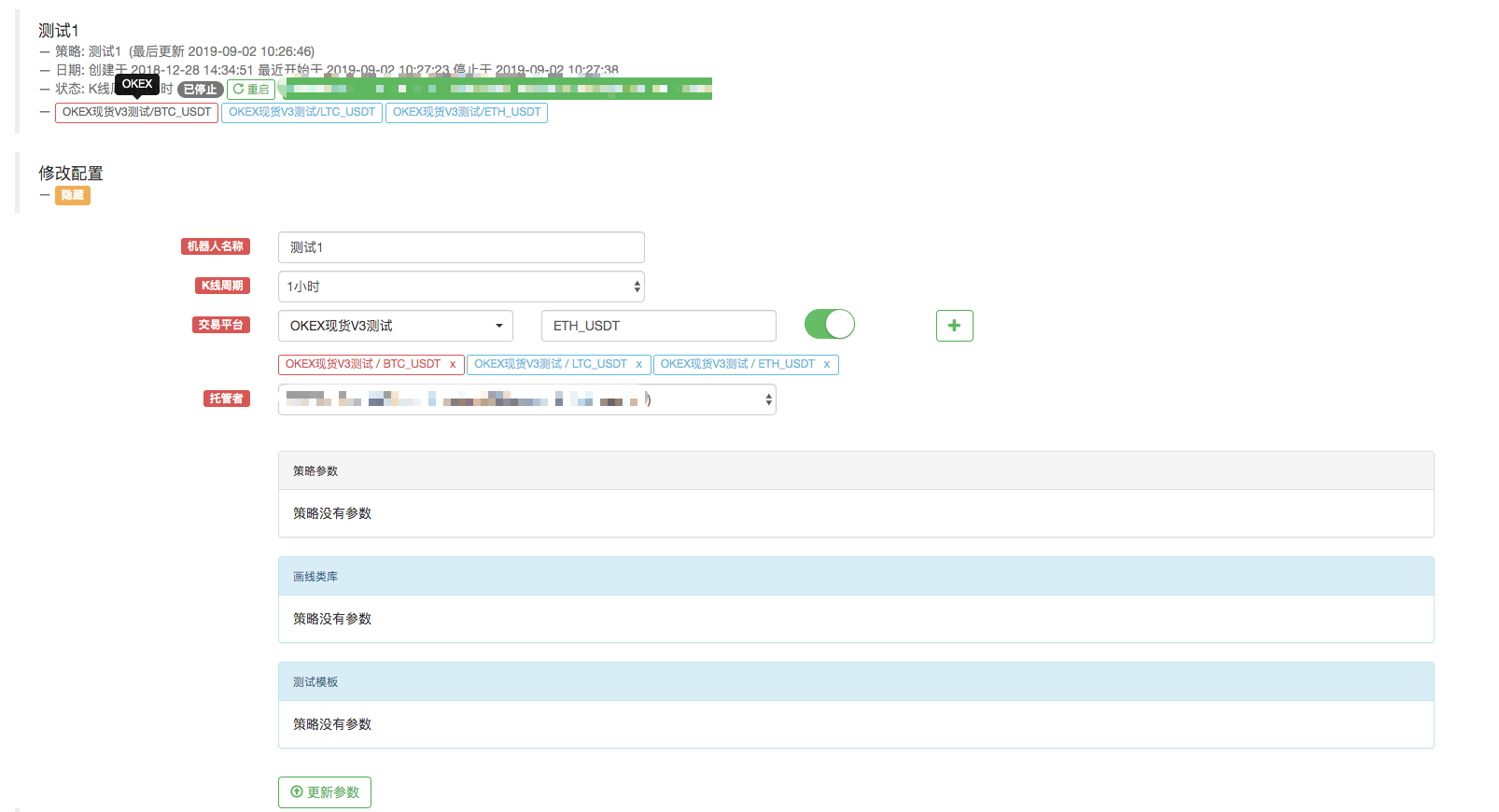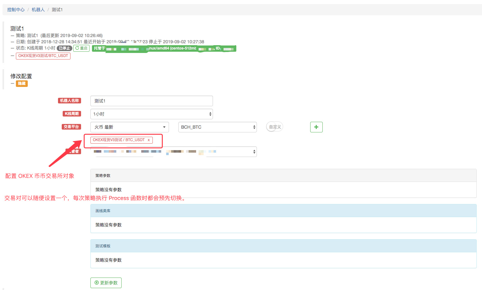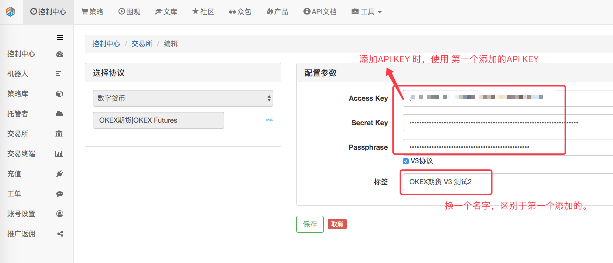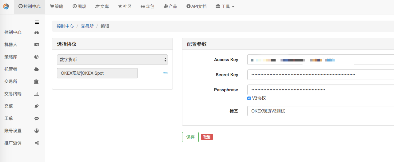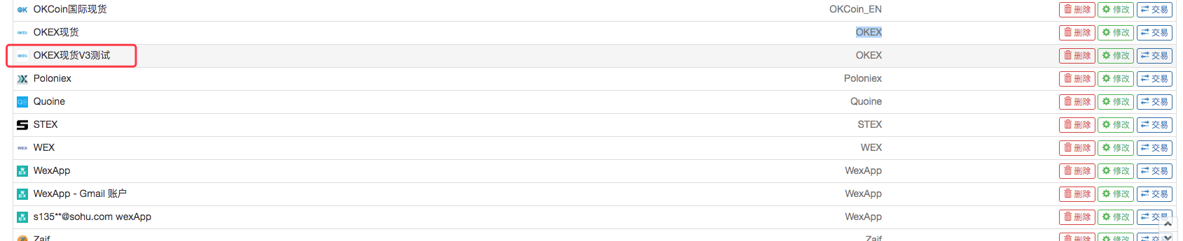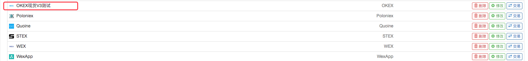 名字是 「OKEX现货V3测试」的交易所对象,在控制中心,交易所配置页面: