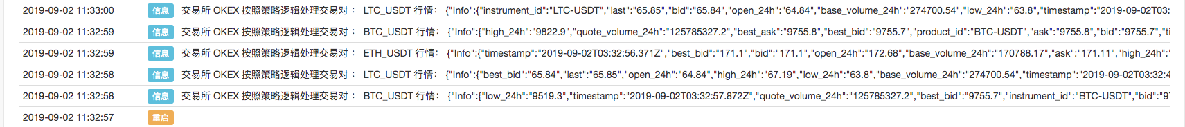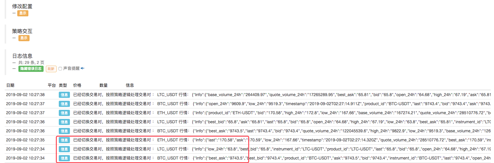 可以看到,这样就实现了在机器人上配置一个交易所对象,切换交易对,获取不同交易对的行情,进行多品种行情,在一种策略逻辑下执行。 可以看到,三种我们定义的交易对:BTC_USDT,LTC_USDT,ETH_USDT ,在循环中依次迭代获取行情,获取行情后,就可以具体对于行情检测,触发策略设计好的交易逻辑。