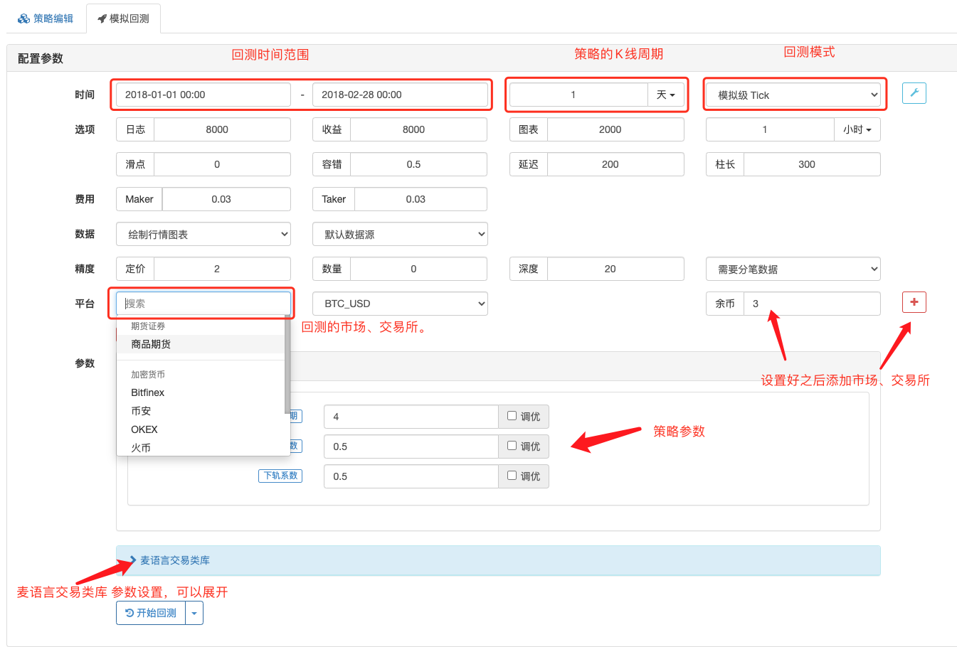 选定回测时间范围后(起始时间、结束时间),设置策略的K线周期,麦语言也支持策略中多K线周期数据。但是这里设置的K线周期是默认K线周期,这里设置为日K线,那么策略运行后自动生成的图表上就是日K线。回测模式分为「实盘级别」、「模拟级别」具体可以查询文档:https://www.fmz.com/digest-topic/4009 。然后选定要回测的市场或者交易所,添加之后就可以回测了,其它参数如果需要调整,例如初始回测资金数值等,可以具体根据需求设置,鼠标放在参数上有提示。