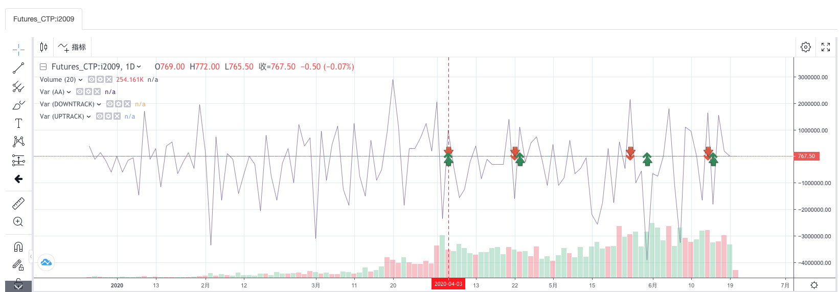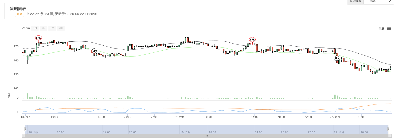 K线图表 根据策略回测、实盘页面设置的默认K线周期,策略会生成K线图表,并且根据策略编写内容,在K线图表上显示变量值曲线。例如例子中的图表: