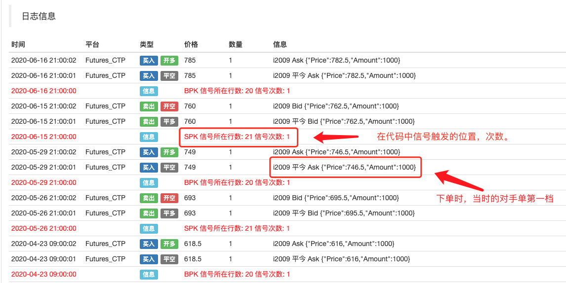 在下单日志价格、数量之后,日志还会附带输出当时的对手盘第一档价格,例如买入开多时,会显示Ask即卖一档位订单的价格、数量。