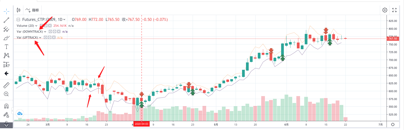 当所要显示的数据、指标线数值大小和标的物价格大小类似(即和K线BAR上的价格数值大小差不多)时,可以显示在主图,例如策略计算出的均线,例如本例中计算出的价格上下轨(UPTRACK和DOWNTRACK)。