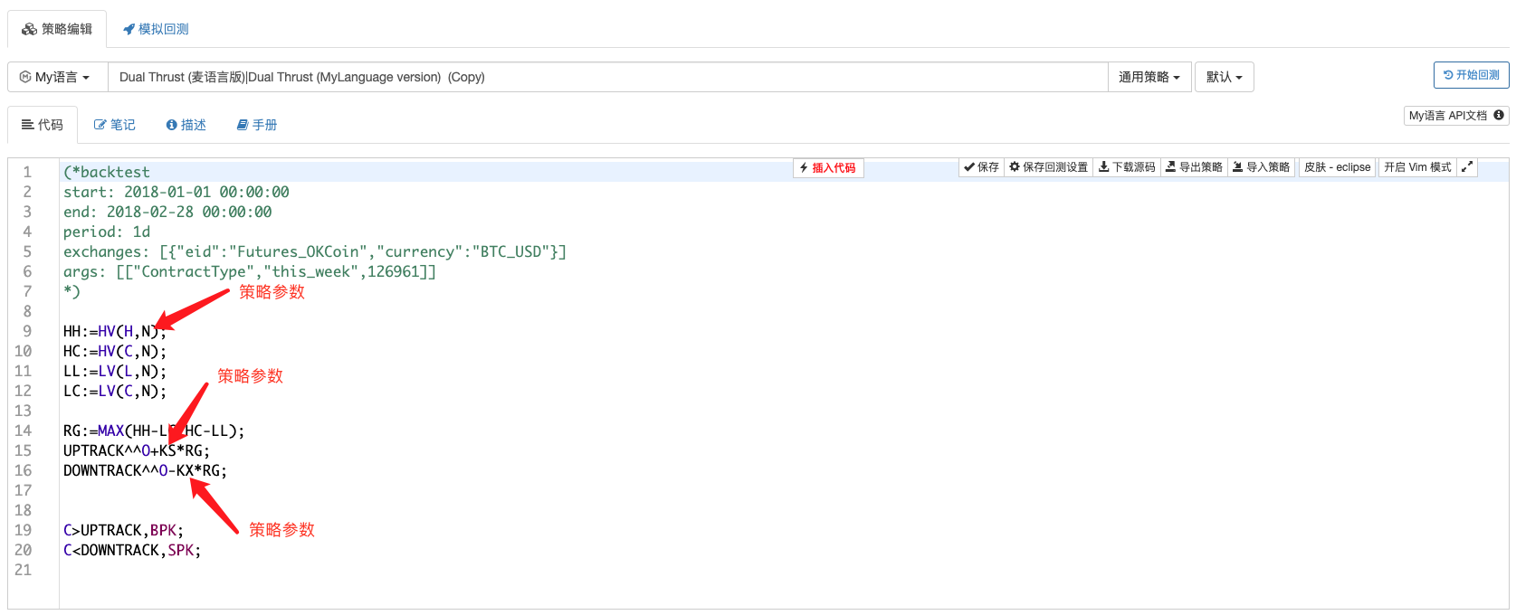麦语言的策略参数和在发明者量化交易平台上的其它语言一样,在策略编辑页面设置,例如我们以麦语言版本的Dual Thrust策略为例。