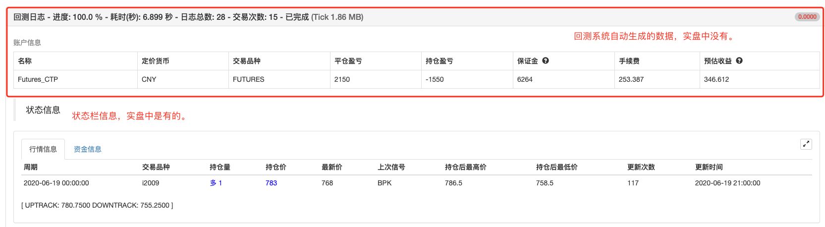 策略运行起来,实盘和回测差别不大,只是回测多了一些回测系统自动生成的统计数据。