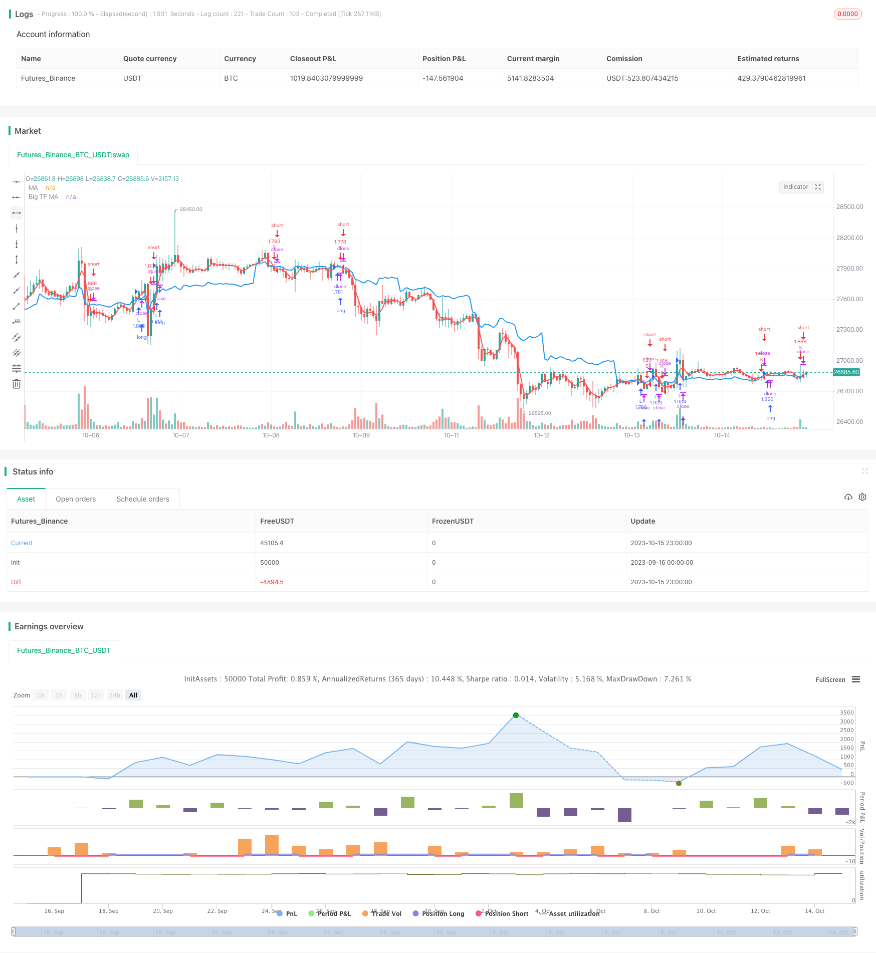 该策略使用两个指数移动平均线,一个是大时间周期的均线,一个是当前周期的均线。当当前周期的均线上穿大周期的均线时,做多;当当前周期的均线下穿大周期的均线时,做空。