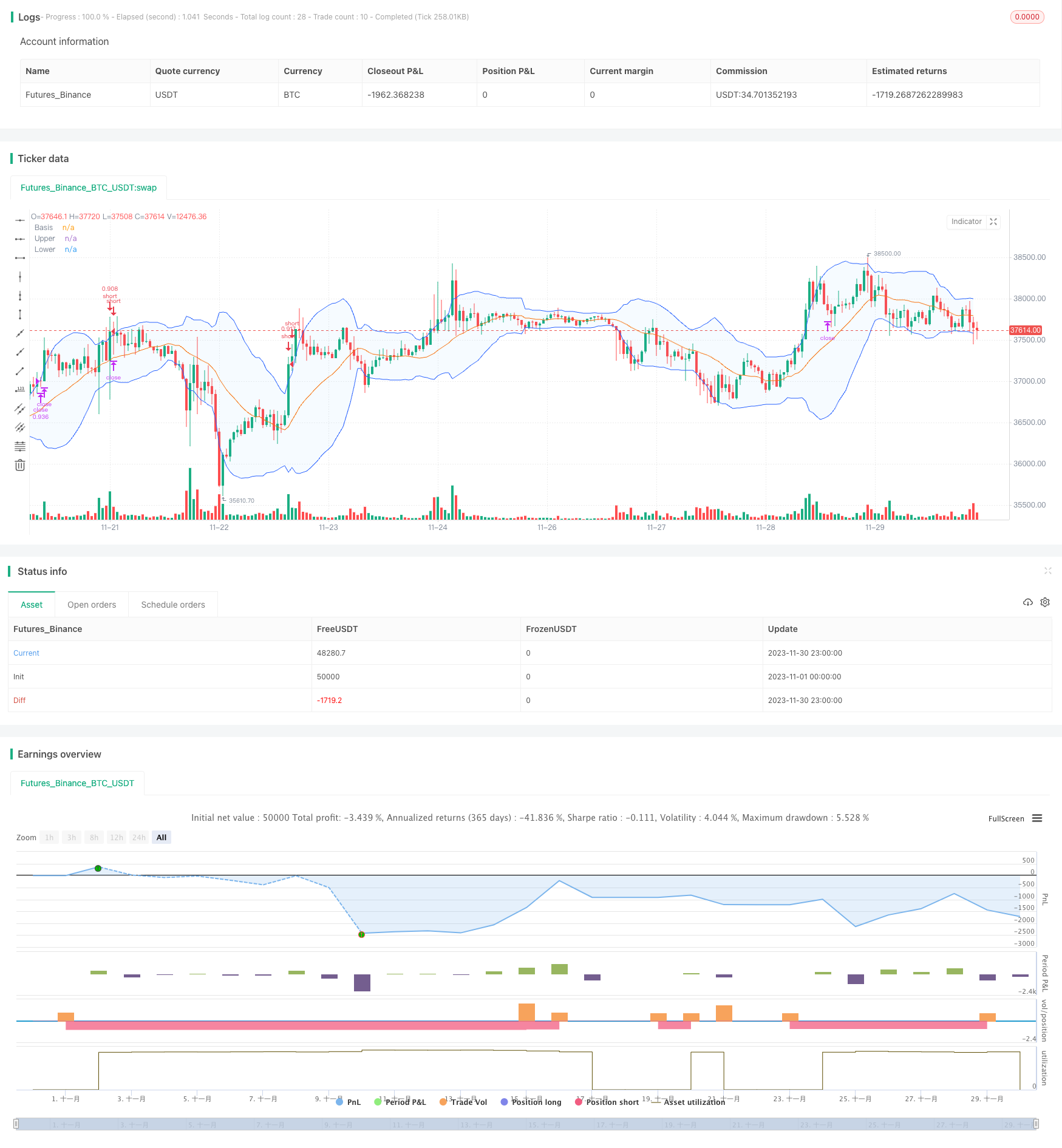 该策略利用布林带指标判断价格是否进入超买超卖区域,结合RSI指标判断是否存在回调机会,在超买区形成死叉时做空,在价格上涨超过布林带上轨时止损。