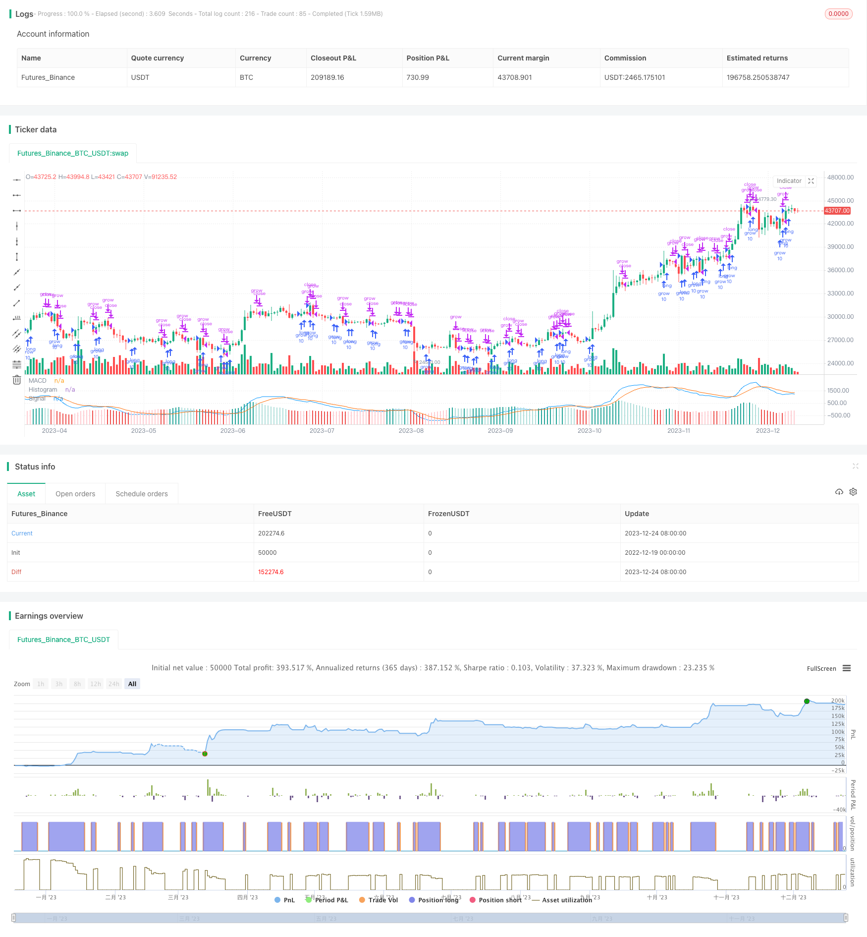 本策略设置输入参数分别为快线长度、慢线长度、价格源、信号线长度平滑周期。可根据不同市场调整参数,寻找最佳参数组合。背景色块显示了回测的时间范围。策略在该时间范围内开仓,之外不操作。