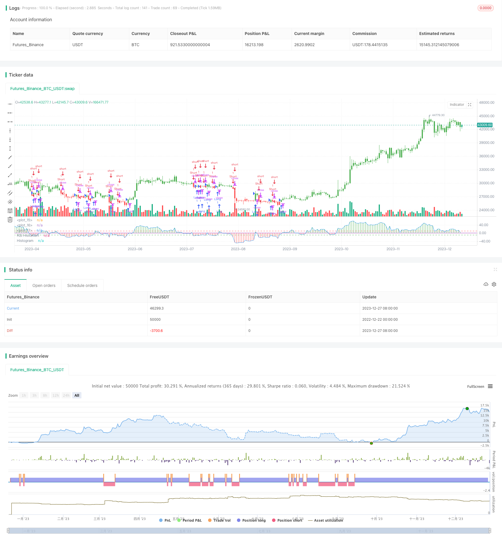 该策略通过RSI指标的Histogram实现买卖信号的触发。