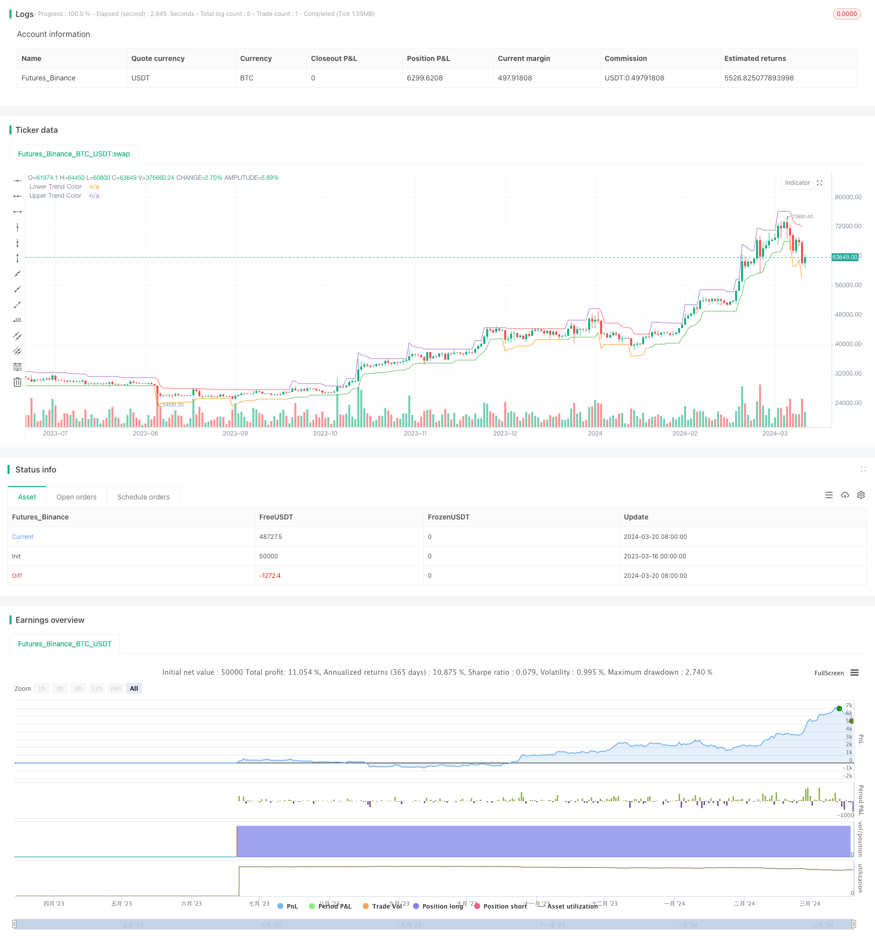 这是一个利用ATR指标和收盘价来捕捉趋势突破的量化交易策略。该策略通过动态计算上下趋势线来判断趋势方向,当收盘价突破趋势线时产生交易信号。该策略同时设置止损和目标价位,并可根据波动性进行移动止损。