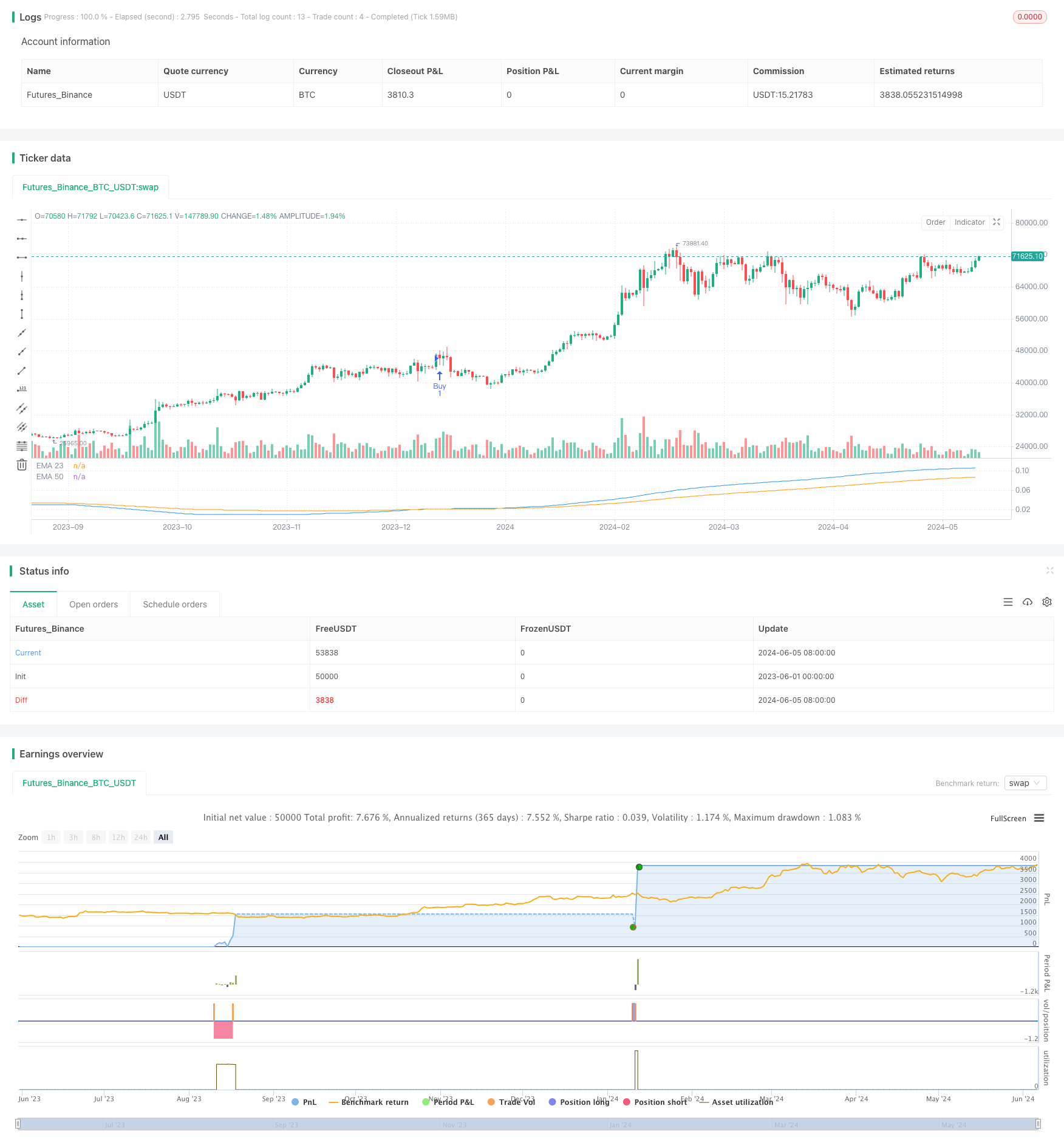 该策略基于Chaikin资金流量(CMF)指标和指数移动平均线(EMA)来生成交易信号。首先计算指定周期内的CMF值,然后使用两条不同周期的EMA来平滑CMF数据。当快速EMA在慢速EMA上方交叉时产生买入信号,反之则产生卖出信号。该策略还设置了止损和止盈条件,以控制风险和锁定利润。