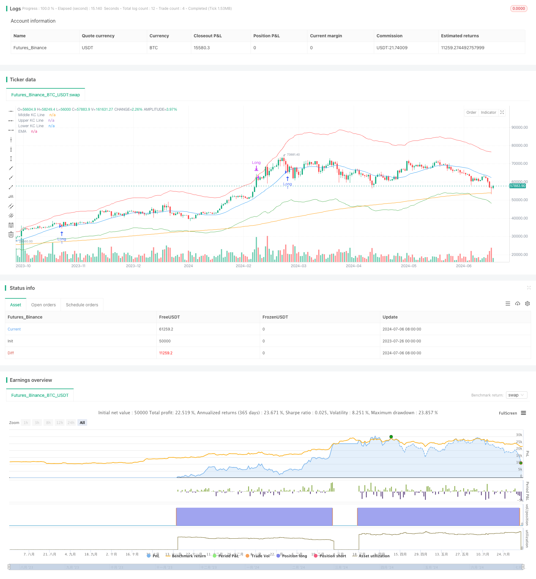 策略的设计理念是在市场出现显著波动后(触及Keltner通道外轨)寻找潜在的反转或趋势延续机会。中轨触及要求有助于确认价格回调,而EMA则用于确保交易方向与整体趋势一致。