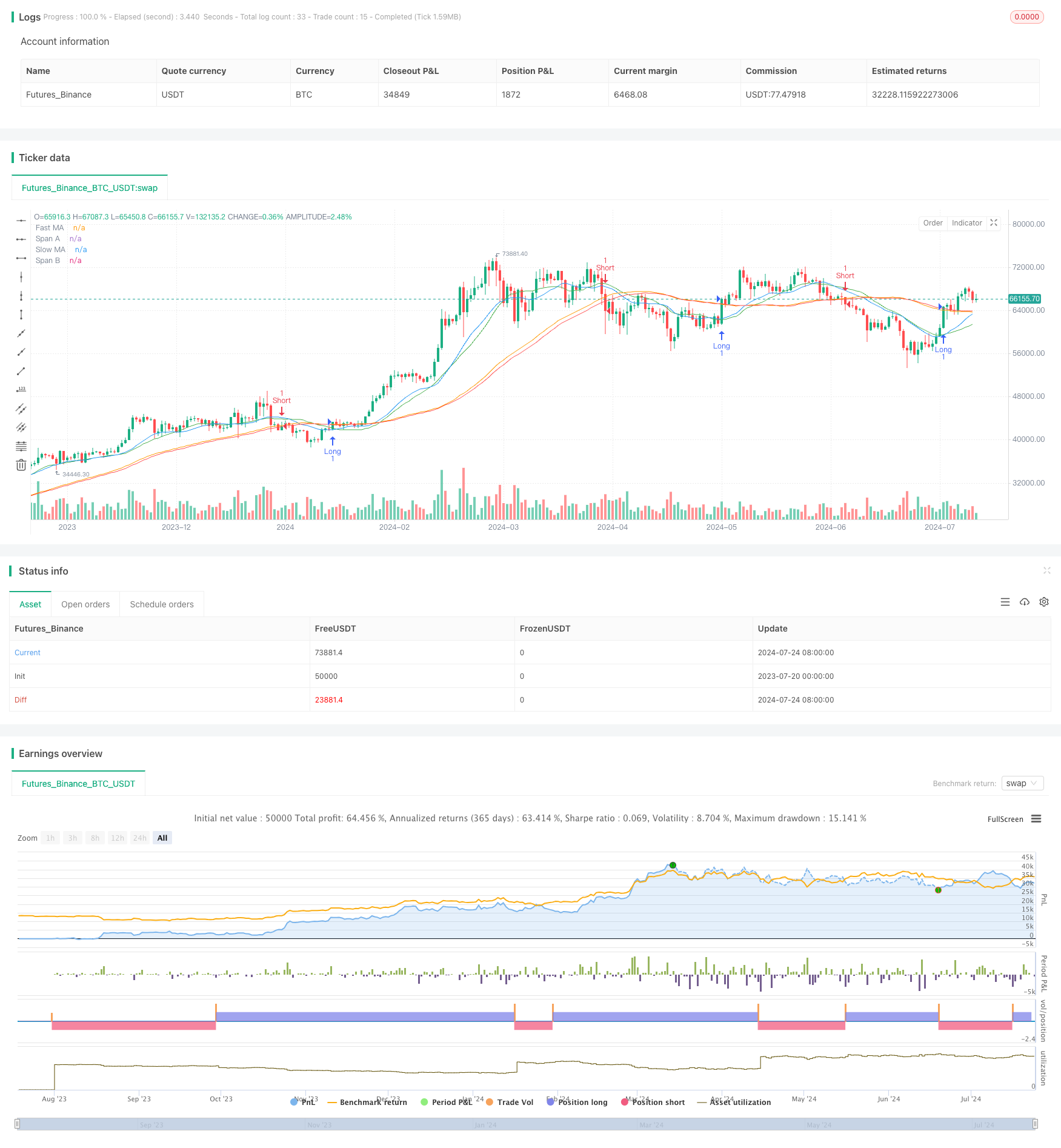 云层动量交叉策略结合均线与成交量确认是一个综合性的交易系统,通过结合一目云图、移动平均线和成交量指标,提供了一个相对可靠的交易框架。该策略的优势在于多重确认机制和趋势跟踪能力,但也面临着指标滞后和参数敏感性等挑战。通过进一步的优化,如动态参数调整、加入止损止盈机制和多时间周期分析等,可以增强策略的稳健性和适应性。交易者在使用此策略时,需要充分了解其原理和局限性,并根据具体的交易品种和市场环境进行适当的调整和优化。