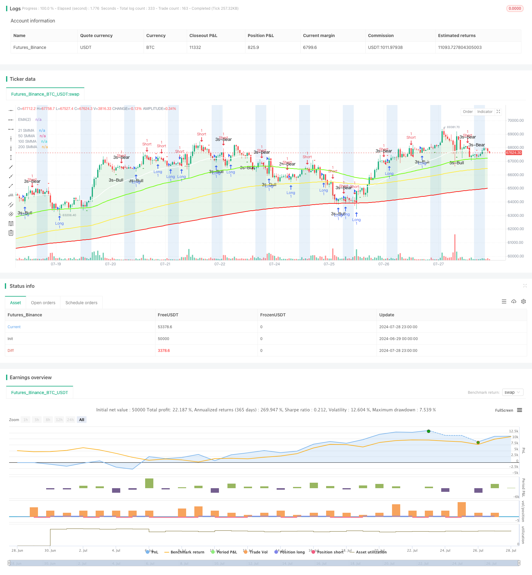 “多重均线趋势跟踪与反转模式识别策略”是一个综合性的技术分析工具,结合了多种先进的交易技术。通过使用多重平滑移动平均线、趋势识别、蜡烛图形态分析和交易时段管理,该策略为交易者提供了一个全面的市场分析框架。它不仅能够帮助识别整体市场趋势,还能捕捉潜在的反转点,为交易决策提供valuable的参考。