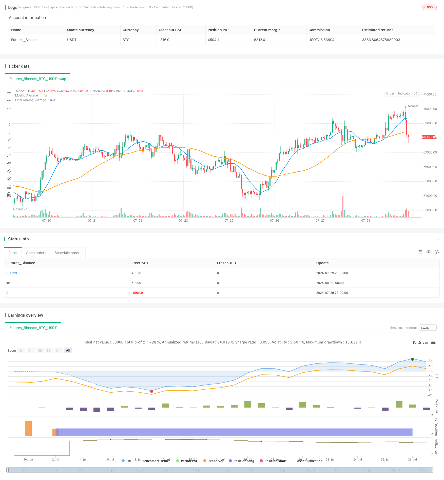 尽管该策略具有很强的潜力,但仍然存在固有的风险,如滞后性和对市场条件变化的敏感性。为了提高策略的稳健性和适应性,建议进行进一步的优化,如实现动态参数调整、整合多时间框架分析和引入额外的过滤机制。