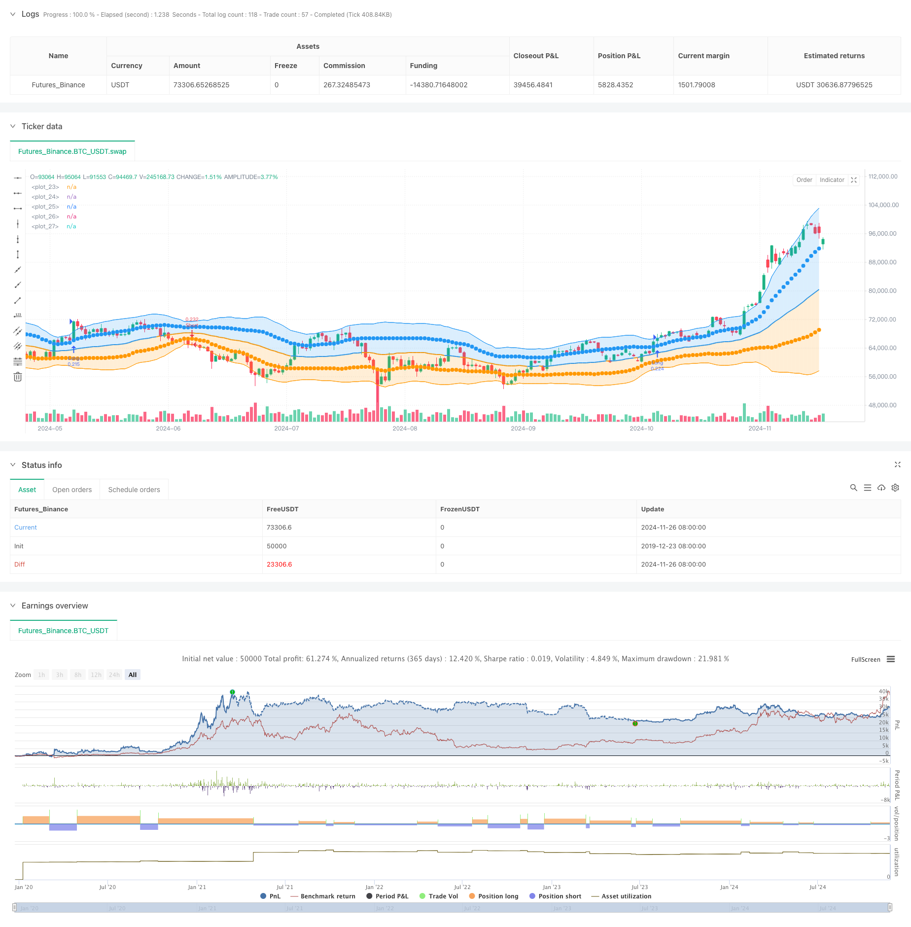 该策略基于布林带指标的创新性应用,通过设置双重标准差带进行市场动量捕捉。策略核心是利用两个不同标准差水平(一倍标准差和两倍标准差)构建的布林带系统,通过价格突破两倍标准差通道时产生交易信号,实现对极端价格波动的把握。该策略通过精确的数学模型和统计学原理,为交易者提供了一个系统化的交易方案。