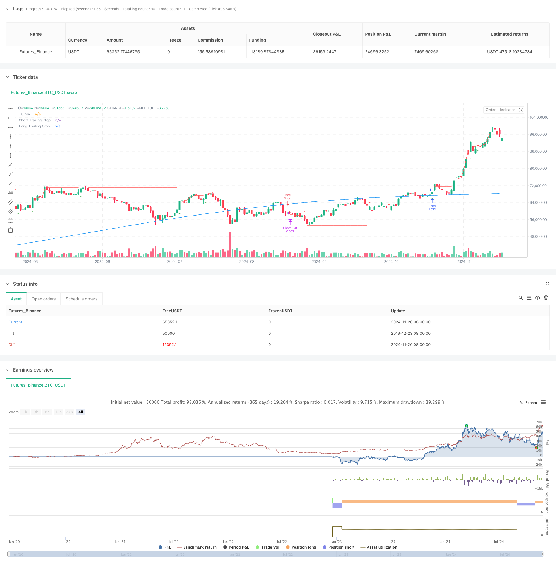 本策略是一个结合T3均线、趋势跟踪和移动止损机制的综合量化交易系统。策略通过T3移动平均线识别市场趋势方向,同时利用Lemon趋势指标和TDFI指标进行信号确认,并配合移动止损和固定止损相结合的风险管理体系,实现对趋势的把握和风险的有效控制。