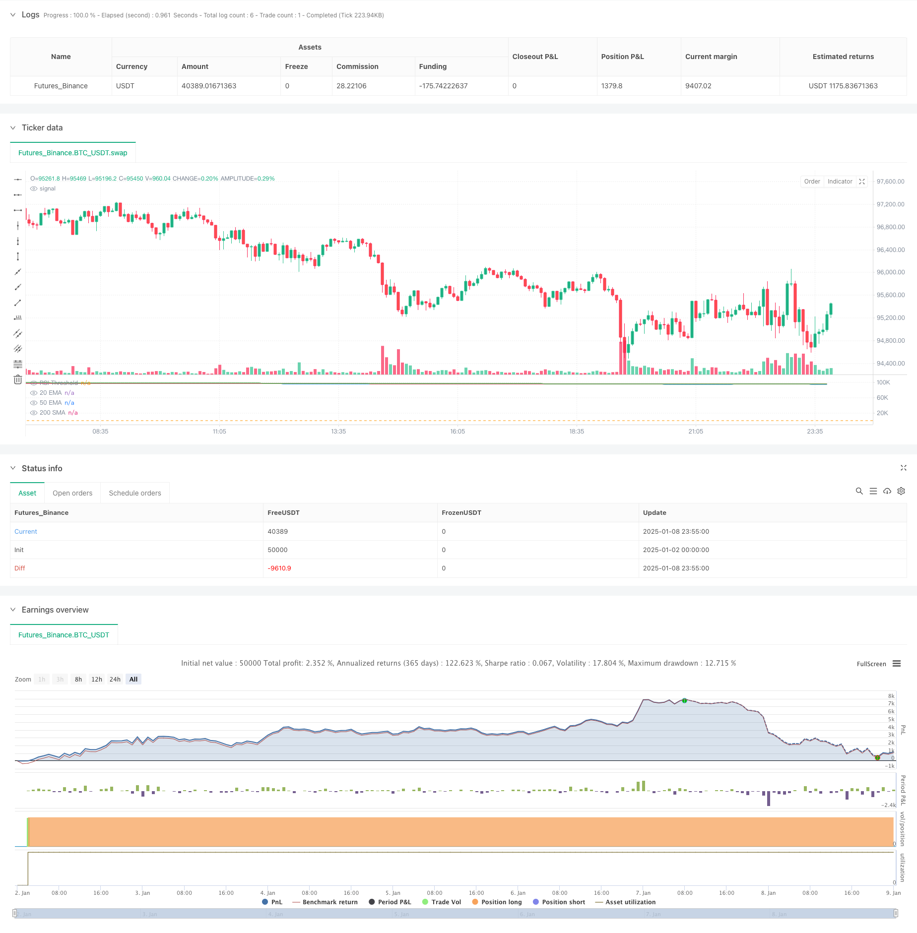 该策略是一个基于多重均线交叉和RSI指标的趋势跟踪交易系统。策略结合了EMA20、EMA50和SMA200三条均线,通过均线的位置关系判断市场趋势,同时利用RSI指标过滤交易信号,在价格突破前期高点时进行交易。策略设置了固定的止盈止损条件,适合在1小时和日线级别上运行。