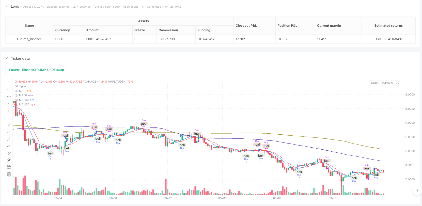 双均线交叉量化交易策略是一种基于技术分析的趋势跟踪系统,核心机制是利用短期移动平均线(MA7)与中期移动平均线(MA10)之间的交叉关系来生成买入和卖出信号。该策略还结合了长期移动平均线(MA100和MA200)作为市场趋势的参考指标,但主要交易信号依赖于短期和中期均线的交叉行为。当短期均线从下方突破中期均线时产生买入信号,反之当短期均线从上方跌破中期均线时产生卖出信号。这种交易方法简单直观,易于实现,适合于捕捉中短期的价格趋势变化。