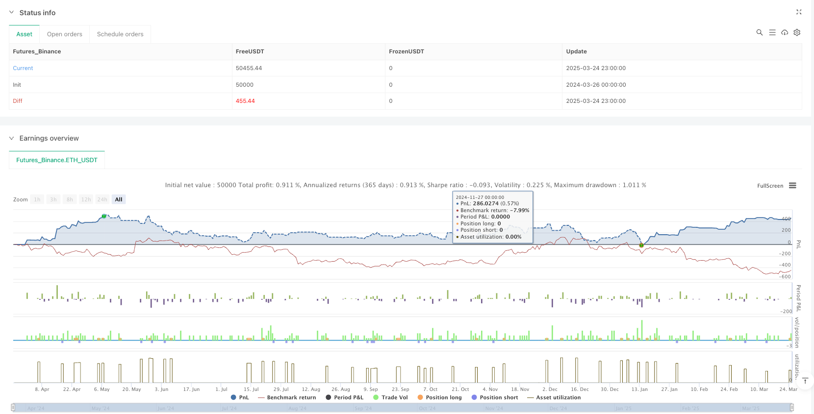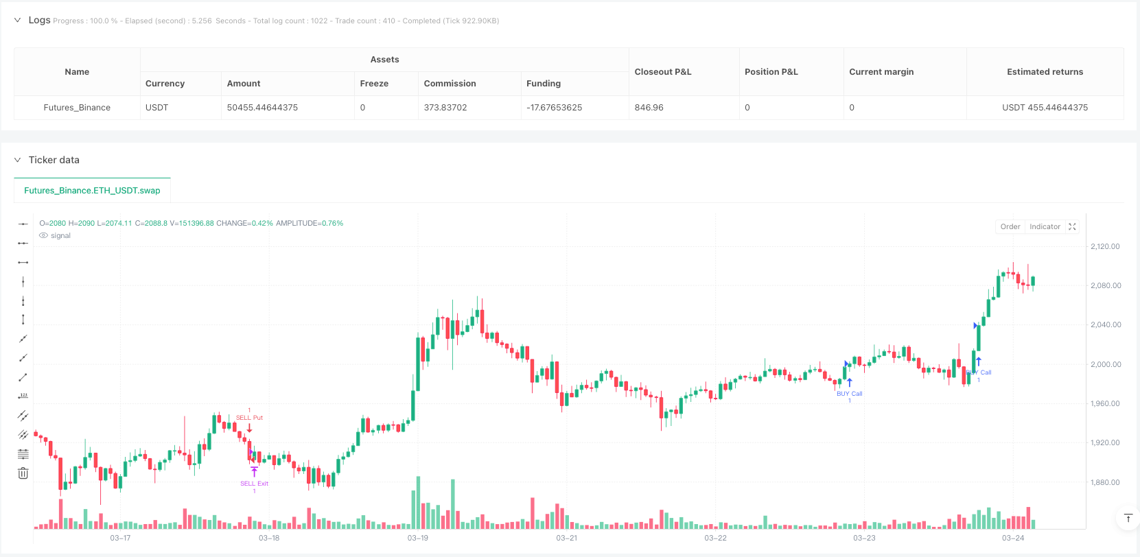 当满足以上所有条件时,策略会发出交易信号。买入看涨期权的条件是:MACD上穿信号线、百分比差异大于阈值、价格在50均线上方、RSI大于30、成交量高于平均水平。买入看跌期权的条件是:MACD下穿信号线、百分比差异小于负阈值、价格在50均线下方、RSI小于70、成交量高于平均水平。