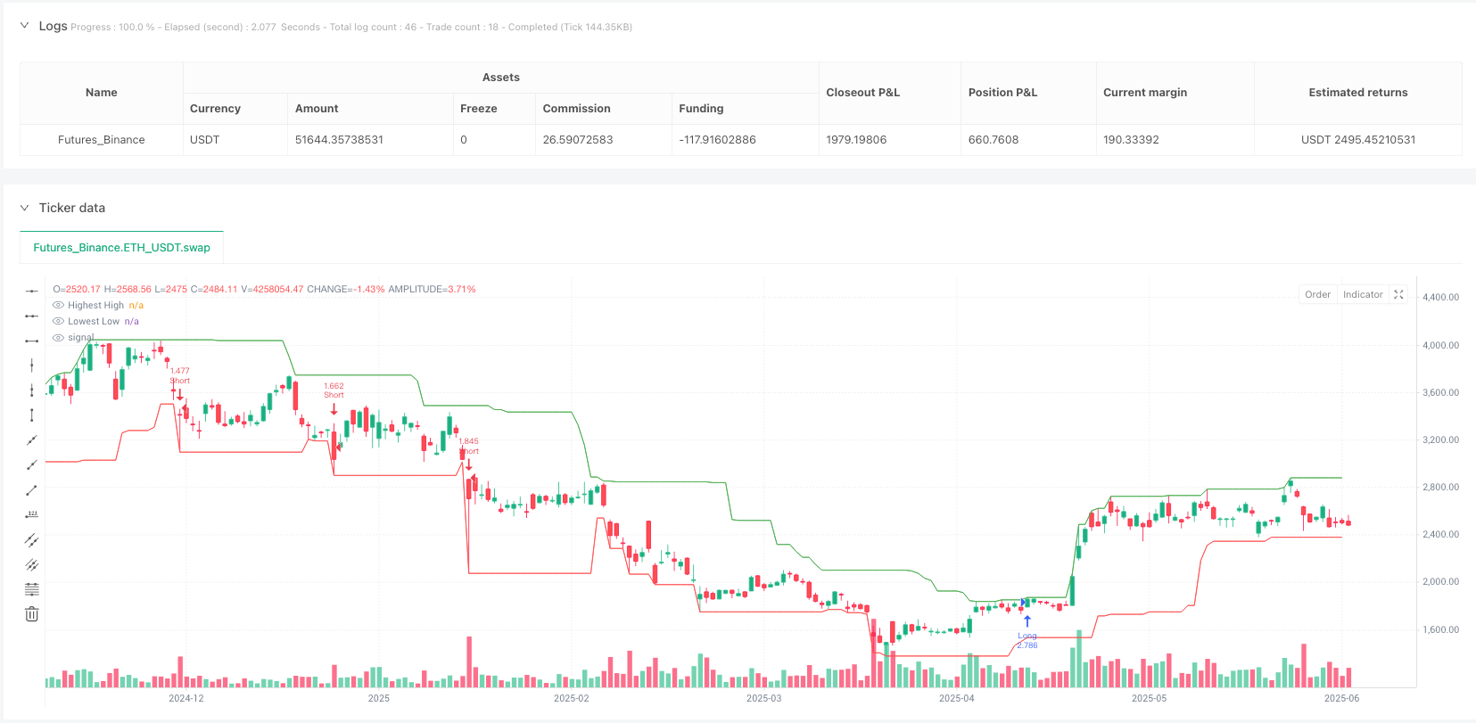 多周期范围突破ATR动态止损策略是一种基于价格突破历史高点或低点的趋势跟踪系统,该策略通过自定义的周期范围来识别潜在的突破机会,并结合ATR指标设置动态止损位。策略核心在于捕捉价格从整合区间突破后的趋势行情,适用于各种时间周期和交易品种。该策略最大的特点是允许交易者根据自己的交易风格调整突破周期参数,无论是短线交易者还是摇摆交易者都可以根据自身需求进行定制化设置。策略采用ATR指标来设置动态止损,使得止损位置能够根据市场波动性自动调整,提高了资金管理的灵活性。