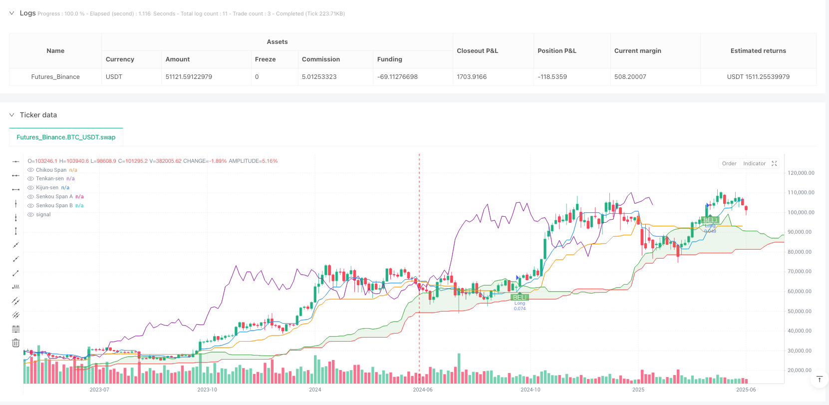 该策略是一个综合性的交易系统,它利用一目均衡云(Ichimoku Kinko Hyo)作为核心指标来确定市场趋势和生成交易信号,同时结合蜡烛图价格行为分析和基于ATR(平均真实波幅)的风险管理机制。这一策略的独特之处在于它要求多重条件同时满足才会触发交易信号,从而提高了信号的可靠性。策略不仅依靠云图(Kumo)来确定总体趋势方向,还利用转换线(Tenkan-sen)和基准线(Kijun-sen)的交叉来捕捉动量变化,并使用延迟线(Chikou Span)作为额外确认,形成了一个完整的交易决策框架。